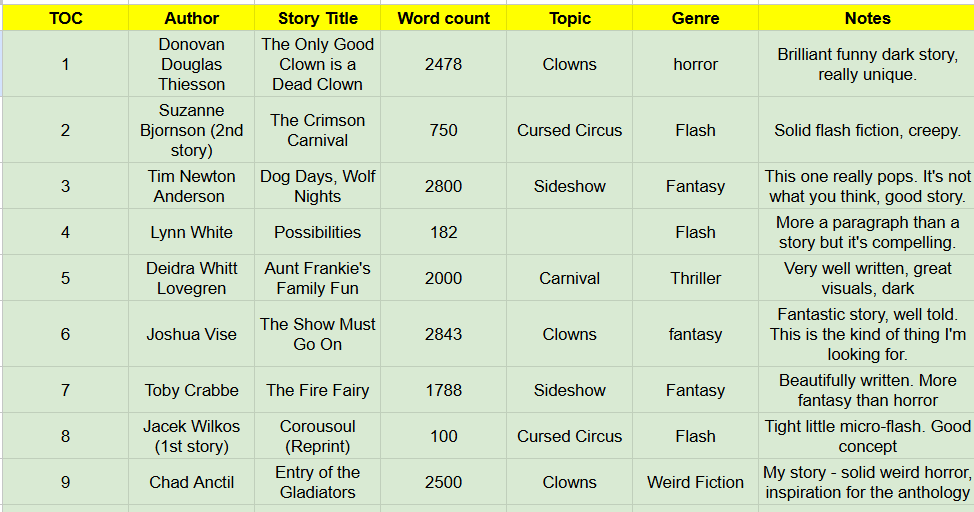 Arranging the table of contents became its own creative challenge. While the publisher offered to handle it, I wanted to be sure the order complemented the reading experience. I built another spreadsheet, organizing the selected stories by theme (clowns, cursed circus, sideshow terrors, etc.), genre (horror, thriller, surreal, atmospheric), and word count. I experimented with sequencing to avoid clustering similar tones or topics, ensuring a smooth narrative flow throughout the collection.