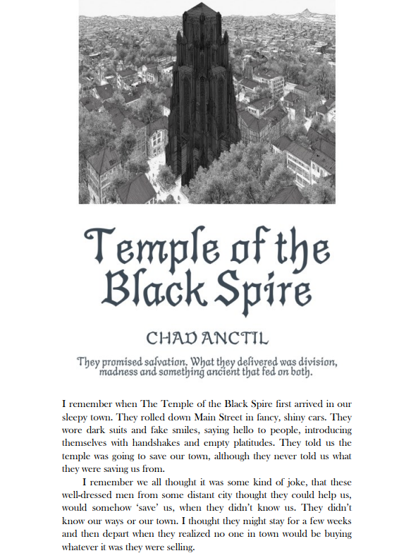 I’m thrilled to share that my story, “Temple of the Black Spire,” is featured in this anthology. It’s a stark morality tale about the dangers of blind trust and the rot that can grow behind sanctified walls. By day, its central figures present themselves as paragons of virtue—pillars of their community, champions of faith. But when night falls, their true nature is revealed: their piety is only a costume, and their appetites are anything but holy.