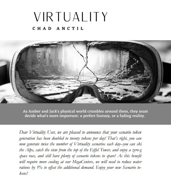‘Virtuality’ is a tale of how Ai is destroying our world while tricking us into thinking it’s just an innocent plaything. People get lost in their virtual world, ignoring the problems of the real world until it’s much too late.
